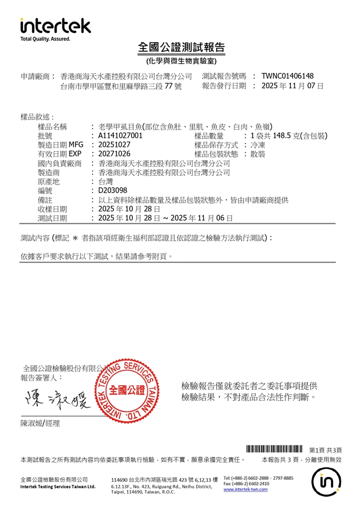 2025-11-07全國公證測試報告樣品名稱 :老學甲虱目魚(部位含魚肚、里肌、魚皮、白肉、魚嶺)