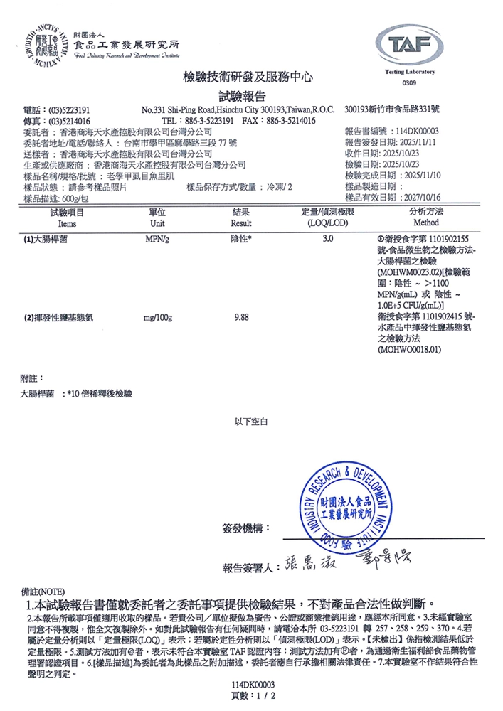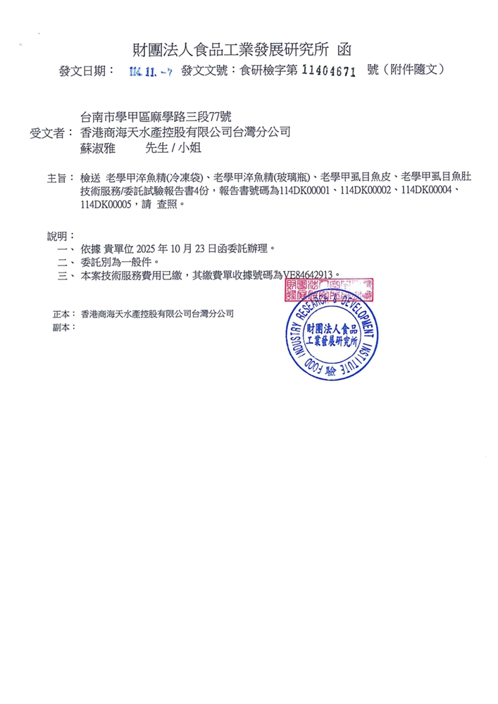 2025-11-05檢驗技術研發及服務中心試驗報告產品名稱:老學甲淬魚精(冷凍袋)/老學甲淬魚精(玻璃瓶)/老學甲虱目魚皮/老學甲虱目魚肚