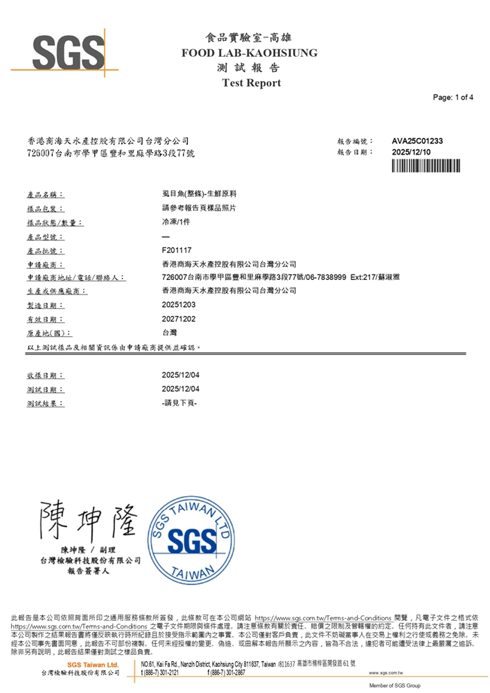 2025-12-10SGS 食品實驗室測試報告產品名稱:虱目魚(整條)-生鮮原料
