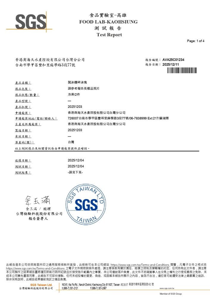 2025-12-11SGS 食品實驗室測試報告產品名稱:製冰機碎冰塊